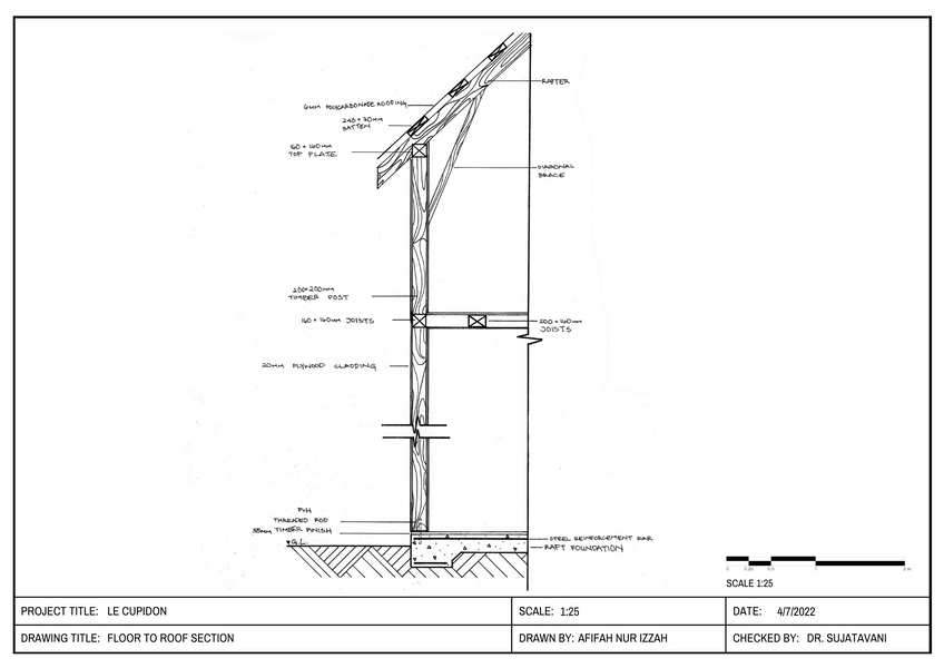 For this assignment, it is a group project where we need to emphasize on producing a construction drawing set that consists of detailing of building elements on superstructure which include floor, wall, door, window, staircase, and roof.