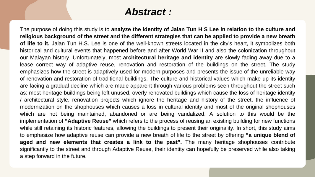 Upon completing this assignment, I was able to appreciate more aboutĀ the historical buildings, especially the shophouses, located in Jalan Hang Kasturi, Melaka. It was fascinating to be able to visit it physically and I was able to learn a lot about them especially its history and the cultures that are still being continued up to this day. Although there are some changes made to the shophouses due to the change of modern times, but they still uphold theĀ physical look of the shophouses instead of diminishing it. Overall, the whole process of doing this project is not only fun but it is also informative.
